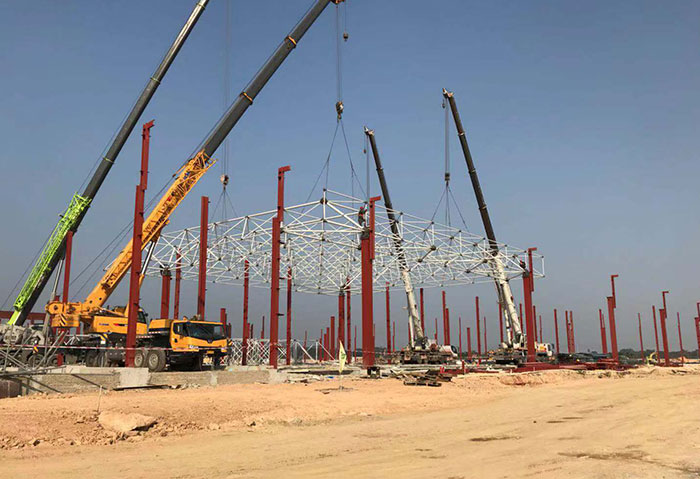 廣東肇慶小鵬新能源汽車 東臺網(wǎng)架沖壓東臺車間 占地20566平方米 本東臺工程跨度大 荷載大 采用東臺螺栓球及焊接求互相搭配式東臺網(wǎng)架 東臺施工方法采用分塊吊裝 空中對接吊裝方法 ( “加上類似于” 億優(yōu)東臺網(wǎng)架為新能源項(xiàng)目增加光彩)